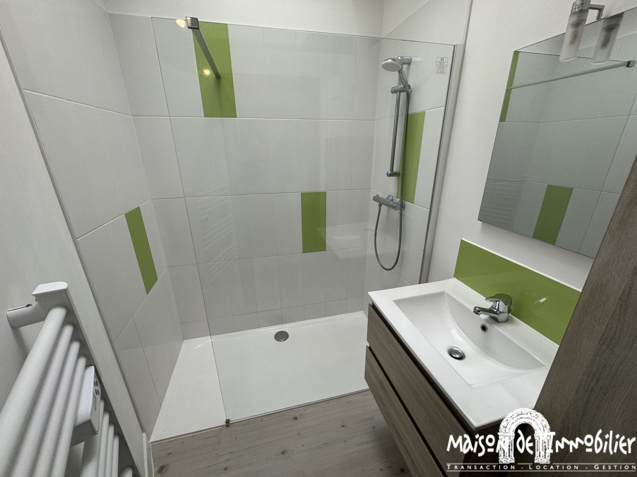 Sur carrelage, murs peints, douche, meuble vasque, sèche-serviettes